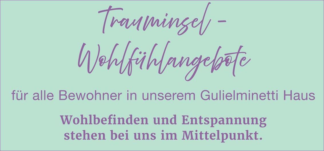 In unserer "Trauminsel" können sich unsere Bewohner entspannen oder sich eine wohltuende Anwendung gönnen. Das Angebot umfasst Kosmetikbehandlung, Gesichtsmassage, spezielle Gesichtsmasken, Maniküre, Hand-, Fußmassage, Fußpflegebehandlung, Klassische Massage, Aroma-Vitalmassage, Lymphdrainage, Schröpf-, Fußreflexzonen-, Klangschalenmassage, Moorpackungen. Besuch nach Vereinbarung. Weitere Auskünfte erhalten Sie hier oder in der Verwaltung des Gulielminetti. |