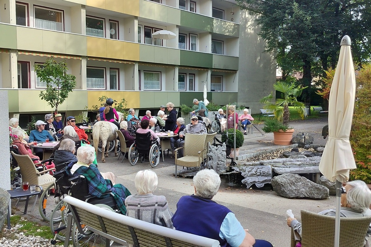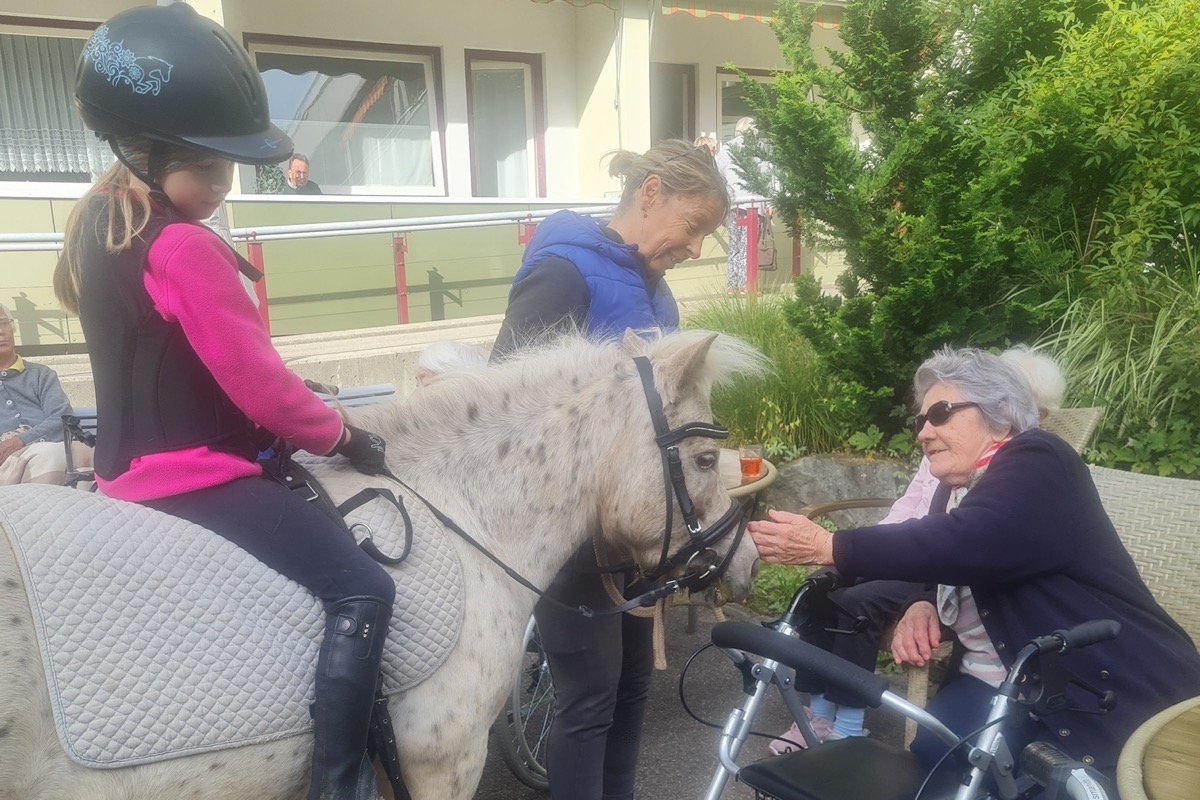 Ein besonderer Nachmittag im Garten des BRK Gulielminetti Seniorenheims: Die Bewohnerinnen und Bewohner erhielten überraschenden Besuch vom Reitstall Marktoberdorf im Gschlatt. Reitlehrerin Josefine Pittino brachte die beiden Ponys „Topmodel“ und „Jupidupidu“ mit. Begleitet wurde sie von der siebenjährigen Nachwuchsreiterin Madlen Hieber, die die Tiere liebevoll vorstellte.