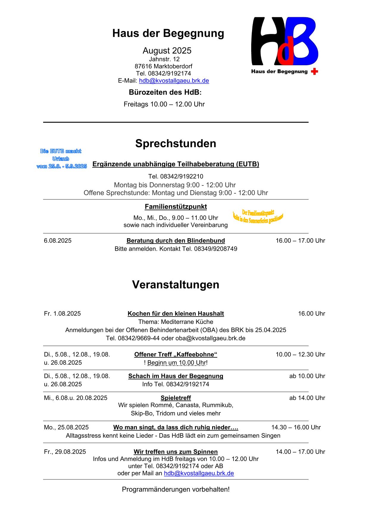 Ob alt oder jung, Einheimische oder Zuwanderer, Behinderte oder Nicht-Behinderte - Das Haus der Begegnung steht allen offen! Mittlerweile bietet das BRK jährlich rund 500 verschiedene Veranstaltungen und offene Treffs für alle Altersgruppen an: Offener Treff "Kaffeebohne", Schachtreff, PC Treff für Senioren, Vorlesen-Basteln-Spielen für Kinder ab 6 Jahren, Offenes Singen, Sonntagskaffee mit Kultur, Handarbeits und Basteltreff, Ideenwerkstatt, Ausstellungen, Wanderungen, Koch- und Backtreff, "Lesen macht Freu(n)de", Seniorenmittagstisch, ...