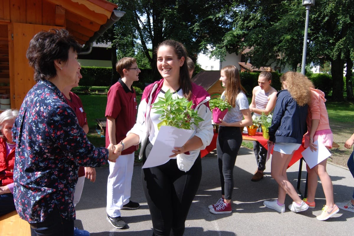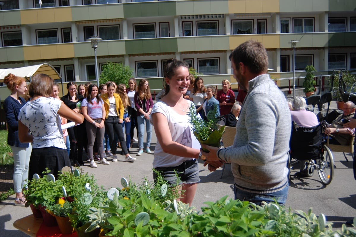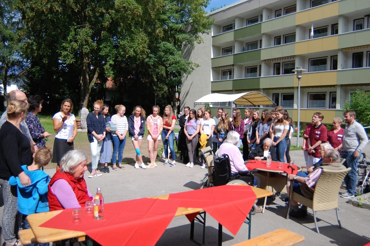 Es klang, als empfingen Sportfans ihre Lieblingsmannschaft. Der Applaus und die Hallo-Rufe der Bewohner des Seniorenwohn- und Pflegeheims Gulielminetti galten 27 Schülerinnen des benachbarten Gymnasiums Marktoberdorf. Das Zusammentreffen im Garten des Hauses war der Abschluss des gemeinsamen Projekts „Lernen durch Engagement“. Seit Februar gestalteten und leiteten drei Zehntklässlerinnen im Wechsel wöchentlich eine Gymnastikstunde im Seniorenheim des Bayerischen Roten Kreuzes.