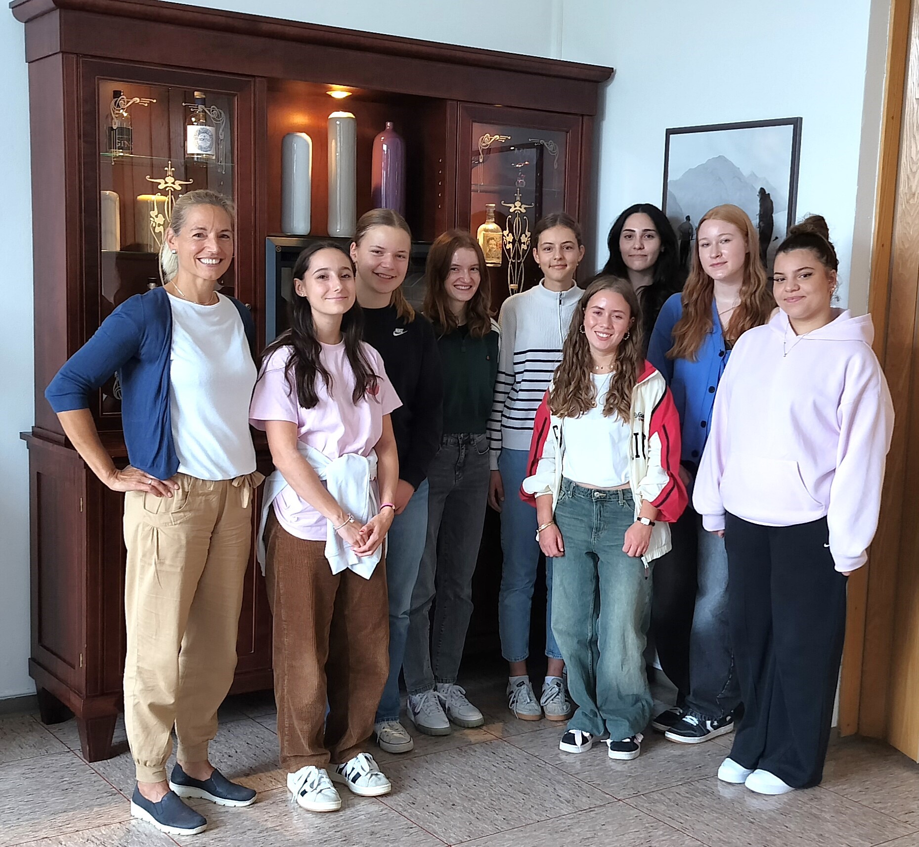 Im Rahmen ihres Projektseminars 'Aktiv sein - aktiv bleiben' erstellten sieben Schülerinnen des Gymnasiums Marktoberdorf nach mehrwöchigem Training und Bewegungsspielen mit einer Bewohnergruppe im Gulielminetti Seniorenwohn- und Pflegeheim ein Planungsbuch für Seniorengymnastikstunden als Abschlussarbeit. Dieses überreichte stellvertretend Gymnasiallehrerin Frau Stefanie Rüger an die Leitung der sozialen Betreuung Frau Claudia Schien.