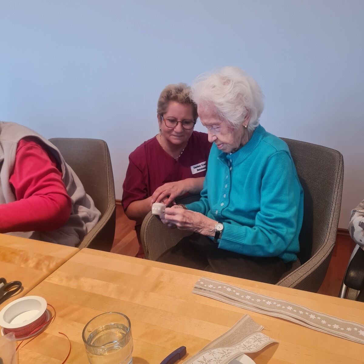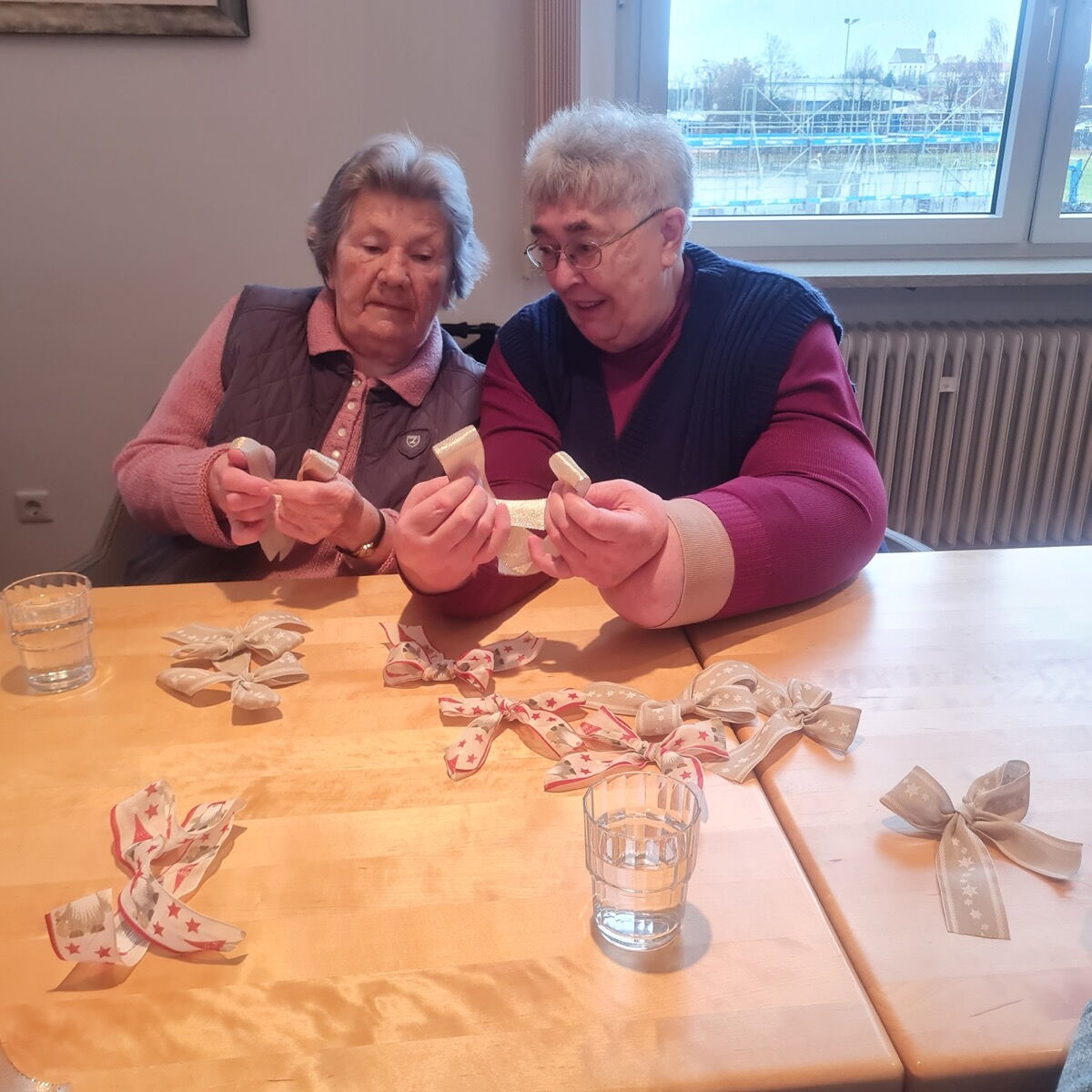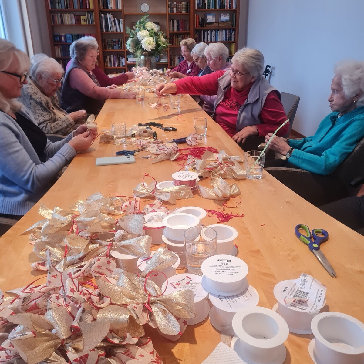 Schon fast zur Tradition geworden: Bewohnerinnen des BRK Gulielminetti Seniorenwohn- und Pflegeheims binden Schleifen für die Christbäume des Marktoberdorfer Weihnachtsmarktes. Auch in diesem Jahr traf man sich wieder in gemütlicher Runde, um gemeinsam zu basteln. Mit viel Freude und Geschick wurden knapp 130 kunstvolle Schleifen einzeln von Hand gebunden. Dabei entstanden nicht nur festliche Dekorationen, sondern auch zahlreiche nette Gespräche und ein Vormittag voller Gemeinschaft und Vorfreude auf die Adventszeit.