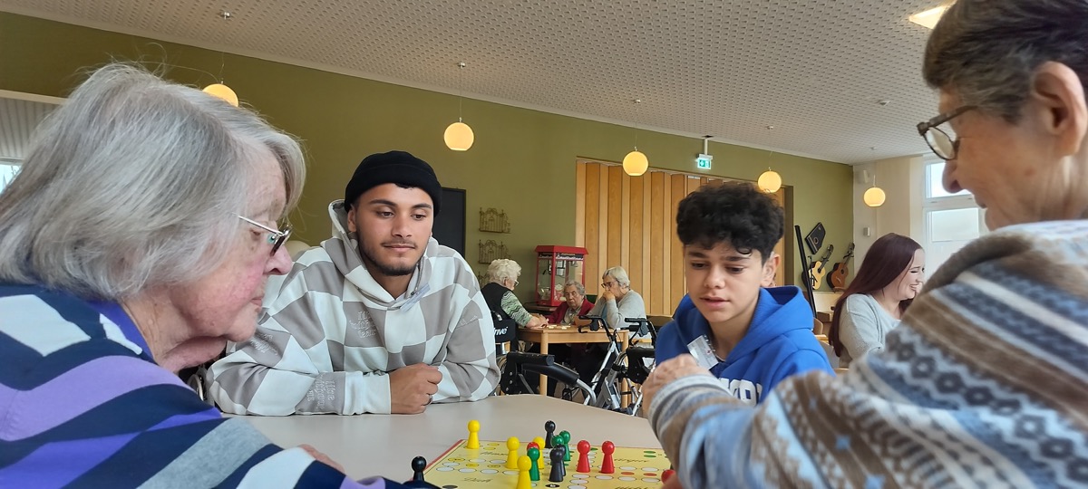 Bei ihren regelmäßigen Besuchen am Mittwochvormittag teilen sich die 14 -15 jährigen Schülerinnen und Schüler in kleine Gruppen um mit den Bewohner und Bewohnerinnen verschiedene Spiele zu spielen. Es wird Mensch-ärgere-dich-nicht, Schach und Rummikub gespielt oder gemeinsam gemalt.