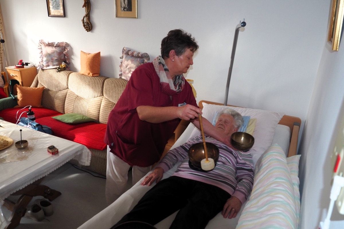 Theresia Unsinn kennt den Ablauf und konzentrierte sich auch dieses Mal schnell auf die Klangquellen. Karin Seemann ist zufrieden: „Sie haben tief geatmet, waren ganz entspannt und haben sogar ein bisschen geschlafen. Die Klangschalenmassage beruhigt mich, sagt Theresia Unsinn. „Ich fühle mich wohl dabei und kann die guten Gefühle danach austeilen.“