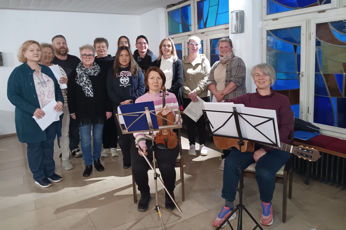 Musikalisch wurde der Gottesdienst vom „Guli-Chor“ gestaltet, der sich aus elf engagierten Mitarbeitenden verschiedener Bereiche des Hauses zusammensetzt: aus Hauswirtschaft, Betreuung, Verwaltung, Pflege, Haustechnik und Ergotherapie. Begleitet wurde der Chor von Olha Skrypkina (Violine) und Alfred Klöck (Trompete), unterstützt von den Gastmusikern Martina Heiland (Gitarre) und Josef Hagen (Orgel). Zur Aufführung kamen die Lieder „Meine Seele ist stille in dir“, „Shalom Chavarim“ sowie „Amoi seng ma uns wieder“. „Der Abschiedsgottesdienst war geprägt von Würde, Trost und Dankbarkeit für die gemeinsamen Jahre, die Erinnerungen und das Miteinander, das über den Tod hinaus verbindet“, gab Claudia Schien, Leitung der Sozialen Betreuung, die Stimmung wieder.