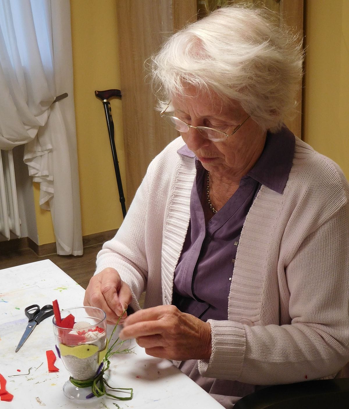 Die Luft wird draußen kühler und im BRK Gulielminetti Seniorenwohn- und Pflegeheim in Marktoberdorf beginnt wieder die Bastelzeit. Mit Freude kommen die Bewohner im Gemeinschaftsraum zusammen und basteln unter Anleitung der Ehrenamtlichen Brigitte Guggemos und Christine Schweiger herbstliche Dekorationen für ihre Zimmer.