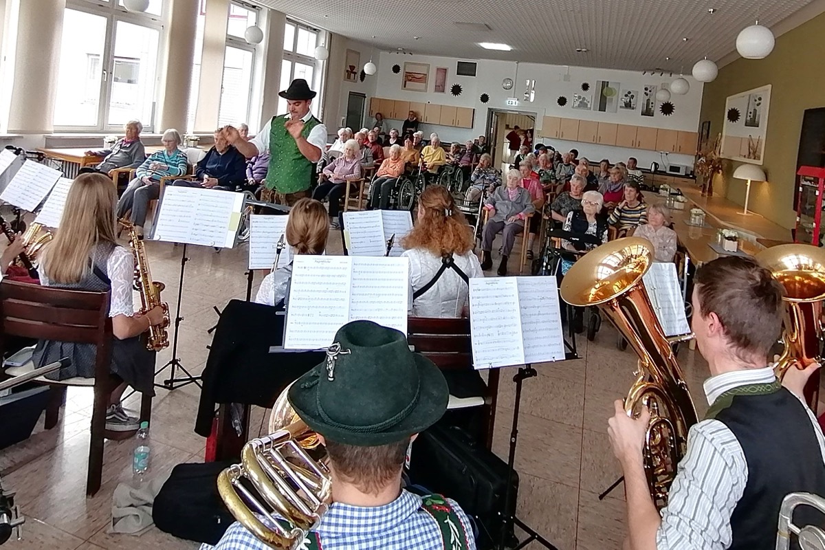 Die Jugendblaskapelle Weißensee unter der Leitung von Reinhard Böck zauberte den Bewohnern des BRK Gulielminetti Seniorenwohn- und Pflegeheimes ein Lächeln ins Gesicht. Zur Polka und “Böhmischer Traum„ klatschten und sangen alle begeistert mit. Ein gelungener Nachmittag für Jung und Alt, der noch lange in Erinnerung bleibt.