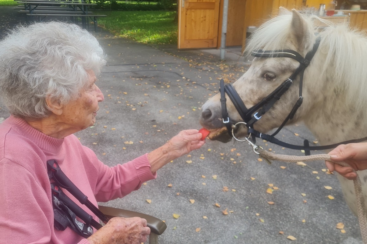 Die Seniorinnen und Senioren erwarteten die tierischen Gäste gespannt im Garten. Mit strahlenden Gesichtern streichelten sie die Ponys und fütterten sie mit mitgebrachten Äpfeln. „Die Begegnung mit den Tieren hat den Seniorinnen und Senioren herzerwärmende Augenblicke geschenkt“, so Einrichtungsleitung Renate Dauner. Auch Josefine Pittino versprach, bald wiederzukommen – sehr zur Freude der Bewohnerinnen und Bewohner.