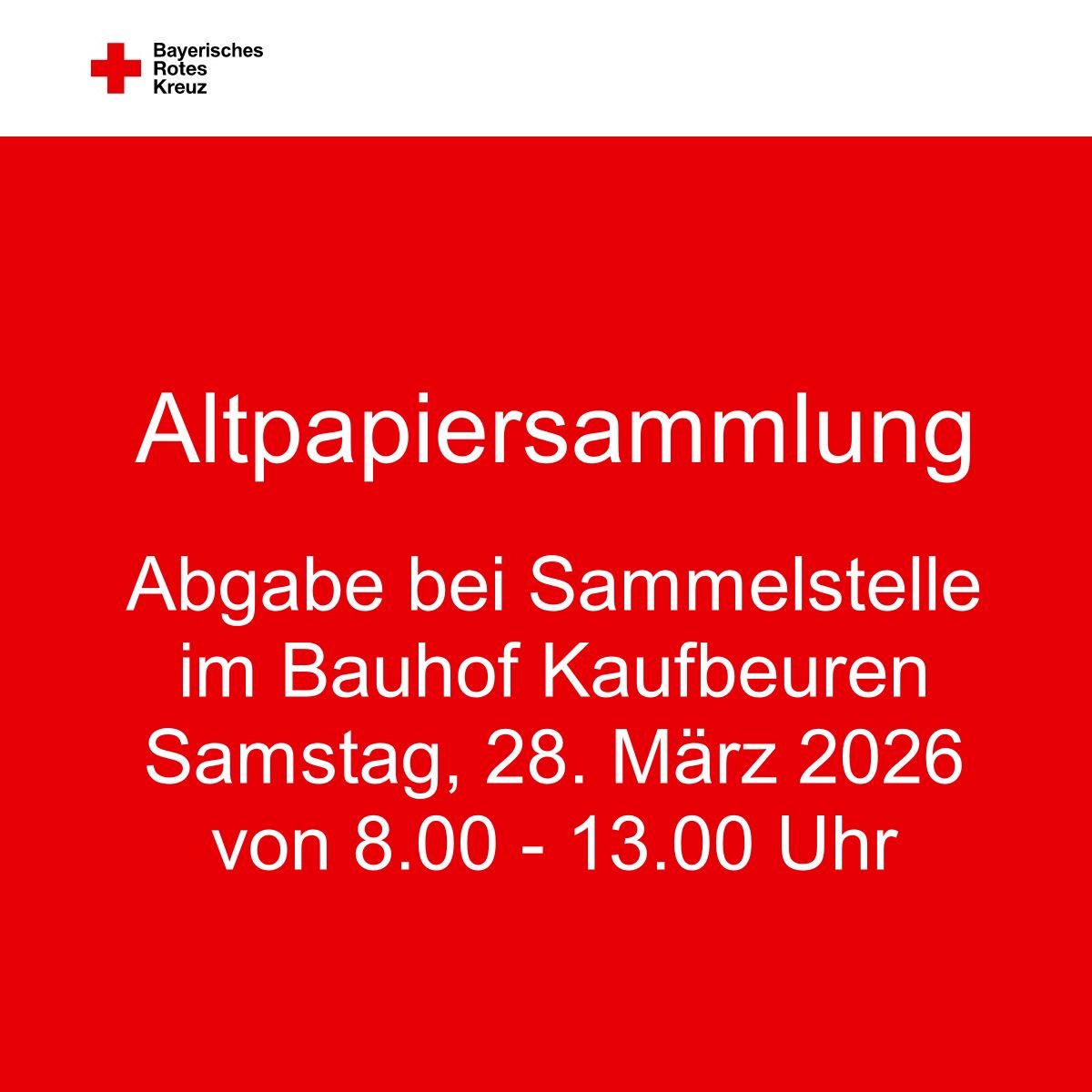 Das BRK Kaufbeuren sammelt am Samstag, 28. März von 8.00 - 13.00 Uhr Altpapier. Es wird gebeten, das Material gut gebündelt bei der Sammelstelle im Bauhof Kaufbeuren, Liegnitzer Straße 1, abzugeben.