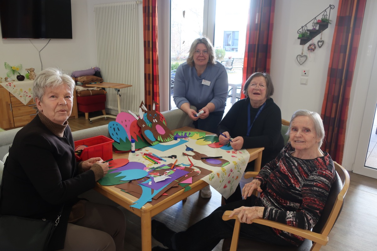Mit viel Freude haben Bewohnerinnen des BRK Seniorenheims St. Martin in Füssen ihre diesjährige Osterdekoration selbst gestaltet. Unter der Anleitung der Präsenzfachkraft wurde auf dem Wohnbereich fleißig gebastelt. Es entstanden bunte Osternester und fröhliche Osterhasen, die anschließend auf dem Wohnbereich aufgehängt und dekoriert wurden. Die Freude am gemeinsamen Basteln war so groß, dass alle Beteiligten am liebsten gar nicht mehr aufhören wollten.