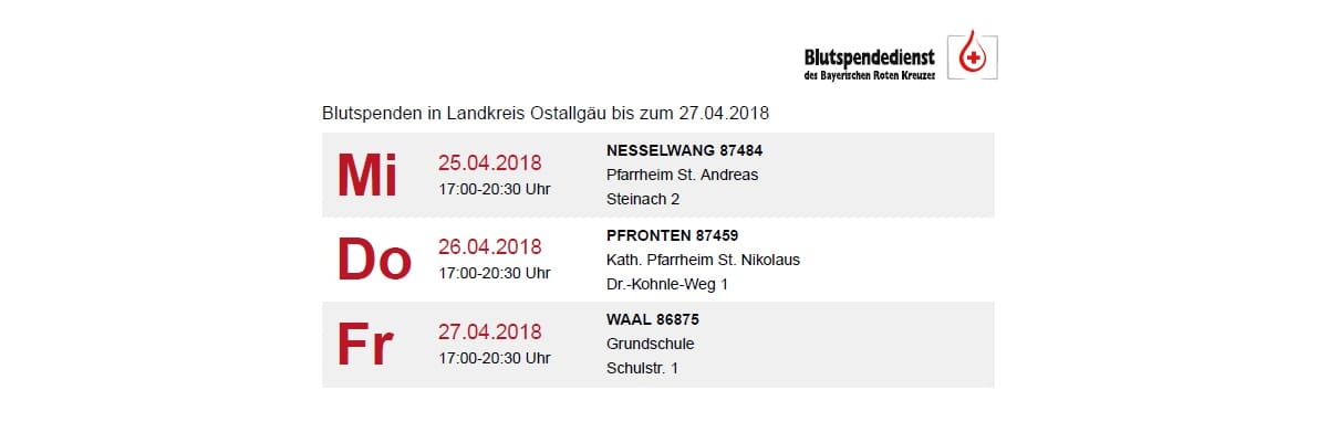 Spendetermine im OSTALLGÄU von Mittwoch, 25.04.2018, bis Freitag, 27.04.2018 – bitte hingehen und teilen: