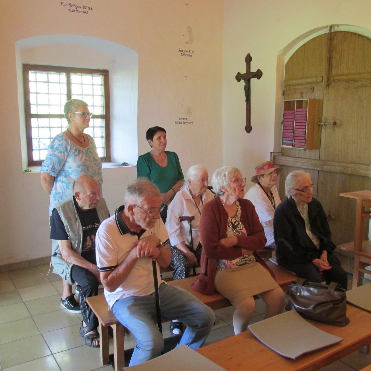 Die Besucherinnen und Besucher erfuhren, dass die Kapelle 1628 von Kaspar von Hohenberg, Pfleger auf Ottilienberg, vermutlich aus Anlass der zu dieser Zeit grassierenden Pest in Auftrag gegeben wurde. Das reizvolle dieser Kapelle ist auch ihre Lage hoch über dem Wertach- und Gennachtal. Schon bei der Anfahrt mit dem Rotkreuzbus erfreuten sich die Seniorinnen und Senioren am Anblick des markanten Baus und genossen nach der Führung den Rundumblick ins Ostallgäu.