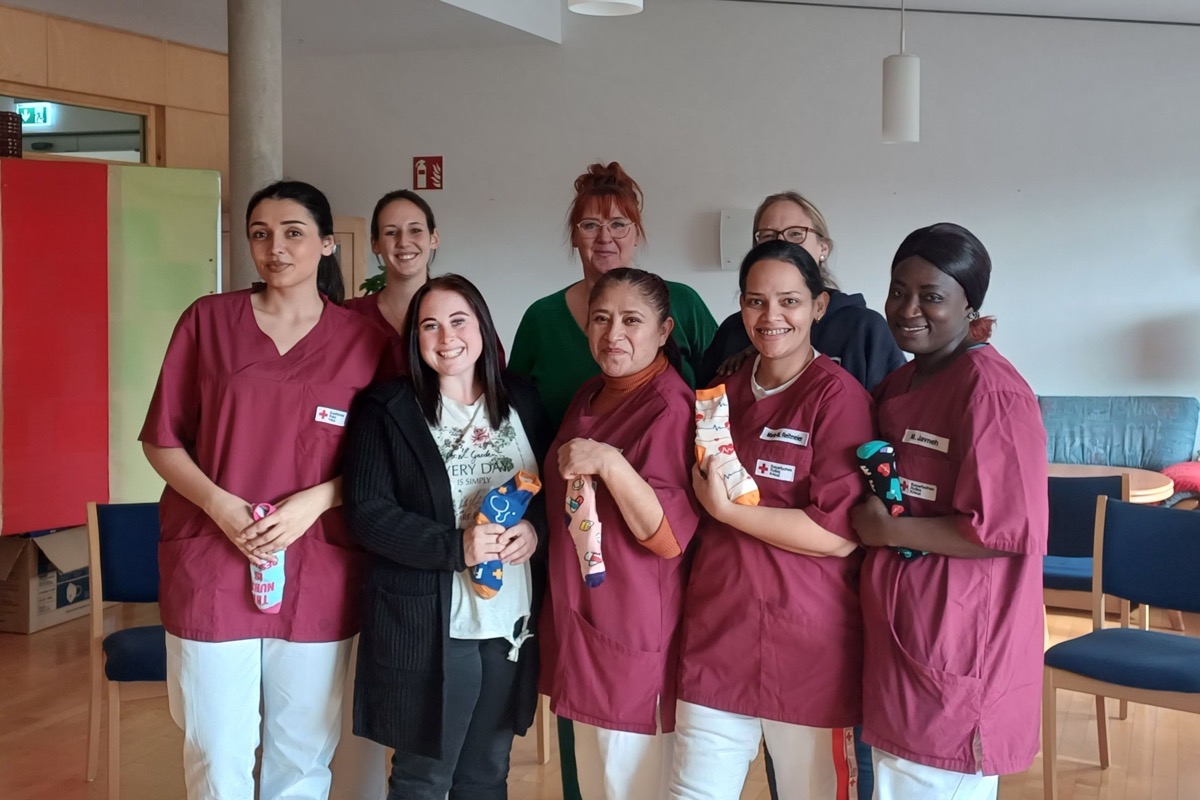 Das Ausbildungsjahr für angehende Pflegefachleute beginnt zunächst mit einem mehrwöchigen Schulblock. Erst danach lernen die Auszubildenden ihren Arbeitgeber genauer kennen. „Damit sich die jungen Leute in unserer Einrichtung von Anfang an willkommen und wohlfühlen, haben wir sie mit einem ganztägigen Einführungsprogramm begrüßt“, so Andreas Hüller, Einrichtungsleitung im Clemens-Kessler-Haus für Senioren. Dazu zählte eine lockere Vorstellungsrunde mit den beiden Pflegedienstleitungen Ramona Köhler und Pamela Jakobczak und ihm. Die Moderation hatten Sabine Bessler und Bernadette Faaß übernommen. Sie sind gemeinsam mit Julia Vogt Praxisanleiterinnen in der Rotkreuzeinrichtung und werden den fünf jungen Frauen während der drei Ausbildungsjahre fachlich und menschlich zur Seite stehen. Neben einer Schnitzeljagd zum Kennenlernen des Seniorenheims bekamen die Auszubildenden anhand von Selbsterfahrungsbeispielen einen ersten Einblick, wie es sich anfühlt, wenn man schlecht hört und sieht. „Ein Erlebnis, das ihnen in ihrer täglichen Arbeit helfen wird, Verständnis für die ihnen anvertrauten Menschen zu haben“, erklärte Sabine Bessler und wünschte den Berufsstarterinnen alles Gute.