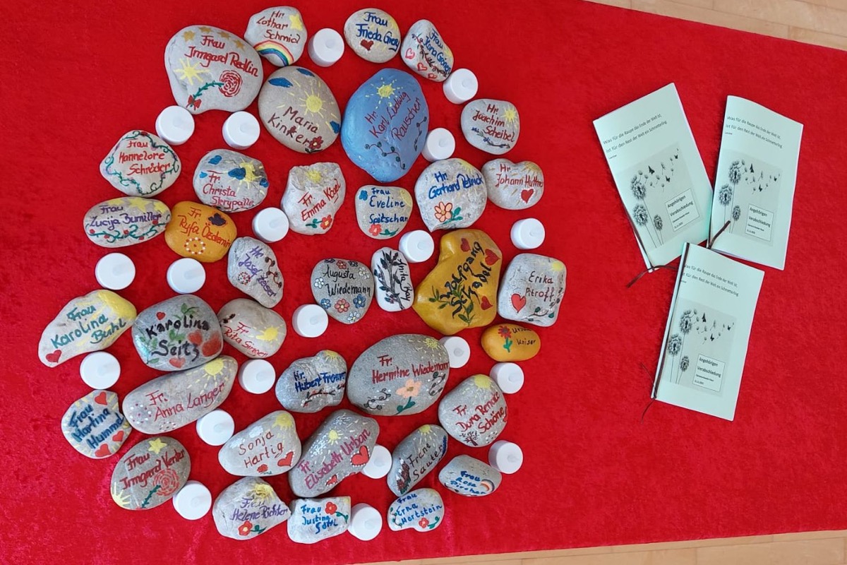 Es ist gelebte Tradition in den Senioren- und Pflegeheimen des BRK Kreisverbandes Ostallgäu, zusammen mit den Angehörigen der verstorbenen Bewohnerinnen und Bewohner zu gedenken und sie zu verabschieden. So auch im Clemens-Kessler-Haus, Zentrum für Betreuung und Pflege in Marktoberdorf. "Dem Tod zu begegnen ist nicht leicht. Auch für die Mitarbeitenden einer Pflegeeinrichtung nicht“, sagte Sabine Bessler, Leitung der Soziale Betreuung in der Marktoberdorfer Einrichtung. „Die jährliche Zeremonie hilft uns, den Verstorbenen zu verabschieden, aber auch diesen in unserer Gemeinschaft weiterleben zu lassen und uns zu erinnern.“ Für jeden verstorbenen Bewohner wurde eigens ein Stein gemalt und mit dessen Namen versehen.