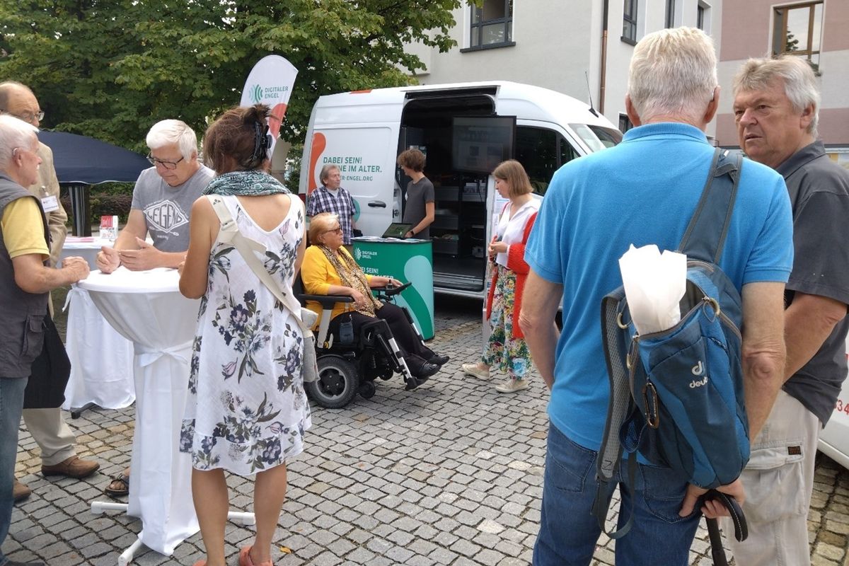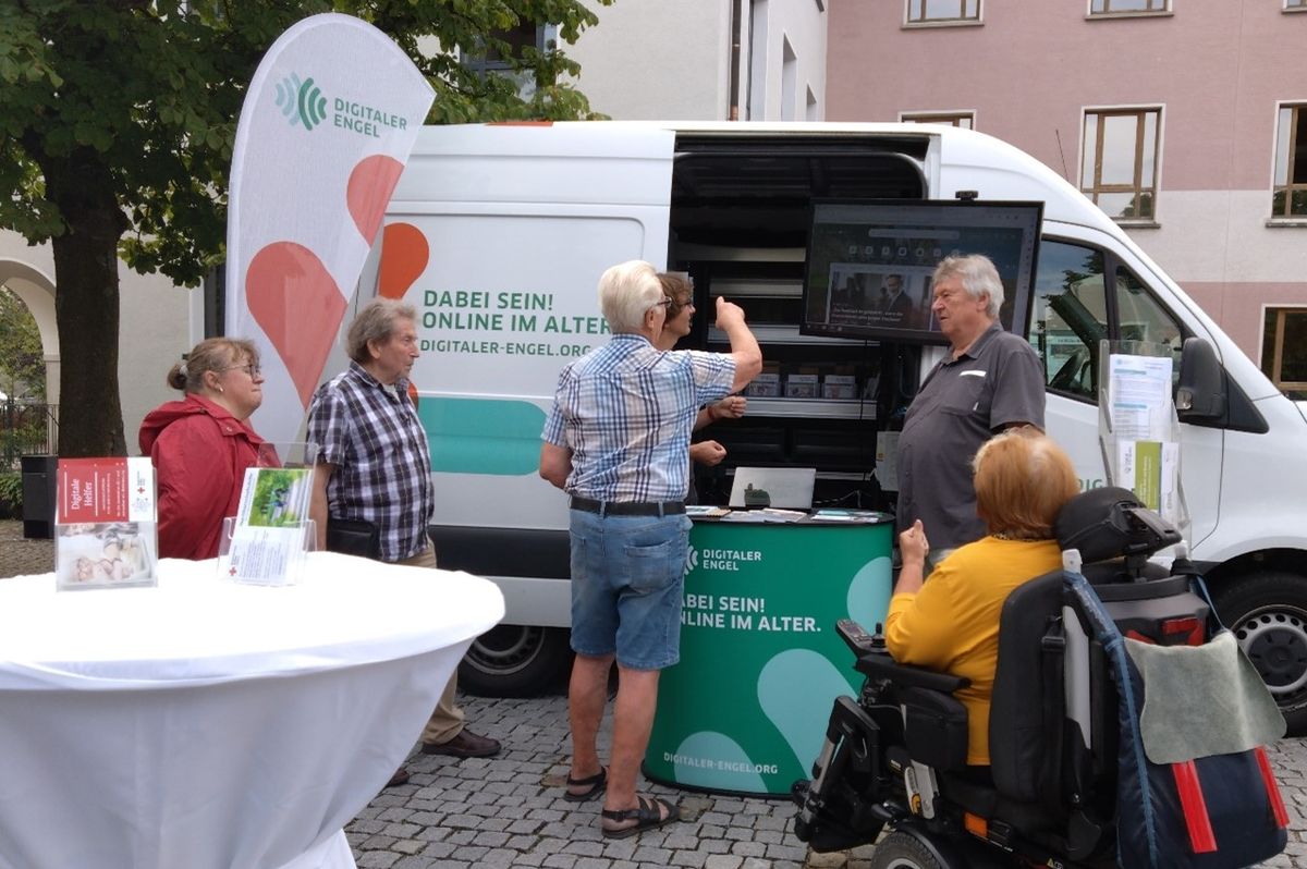 In Marktoberdorf stand das Infomobil am Vormittag vor dem Rathaus. Unterstützt wurde Herr Diller von Annett Filser (Leitung der BRK Nachbarschaftshilfe) sowie Vertreterinnen und Vertretern lokaler Angebote, die Ältere und Menschen mit Behinderung bei Fragen rund um Digitales unterstützen.