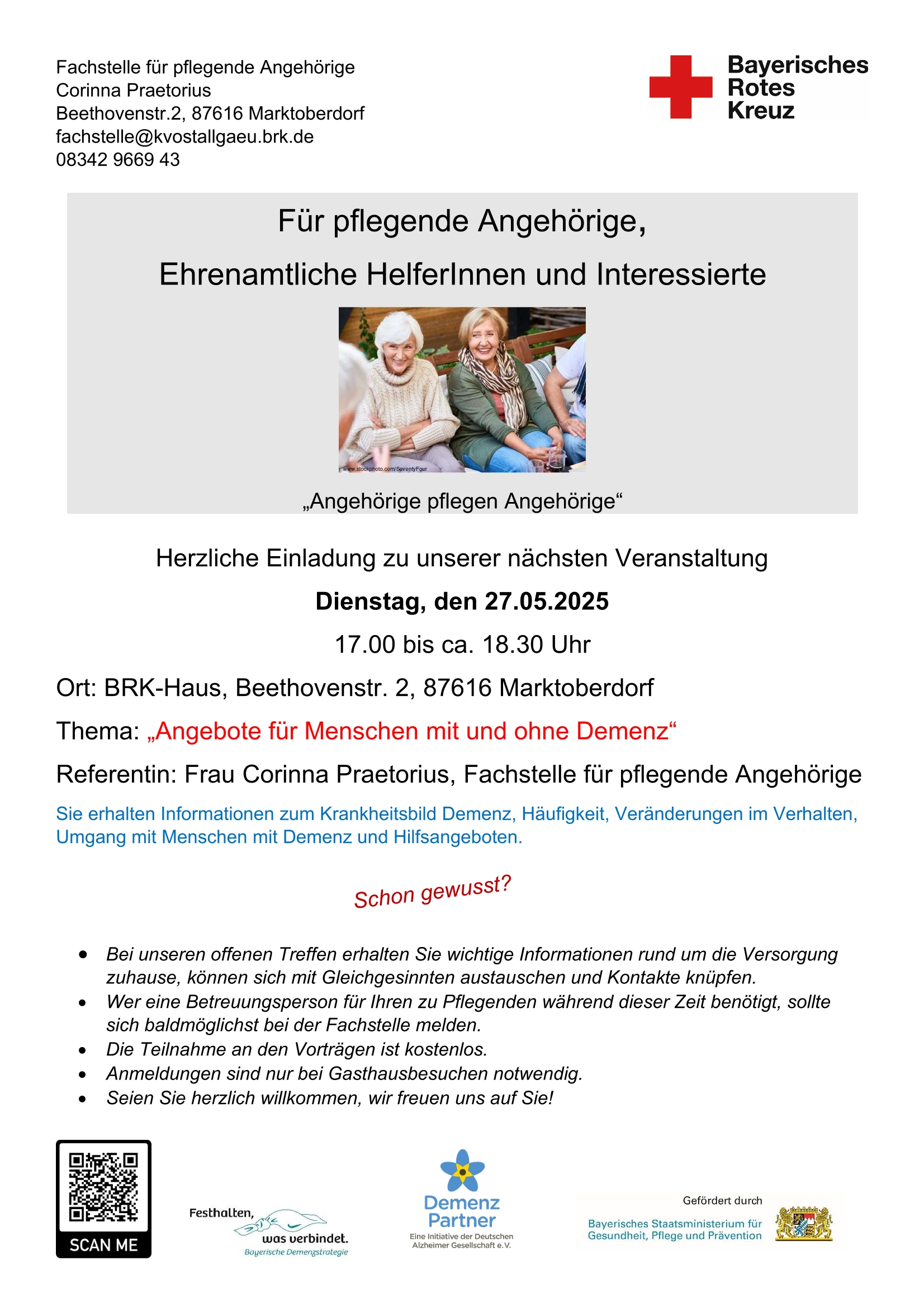 Einladung Angehörigentreff zum Thema: „Angebote für Menschen mit und ohne Demenz“