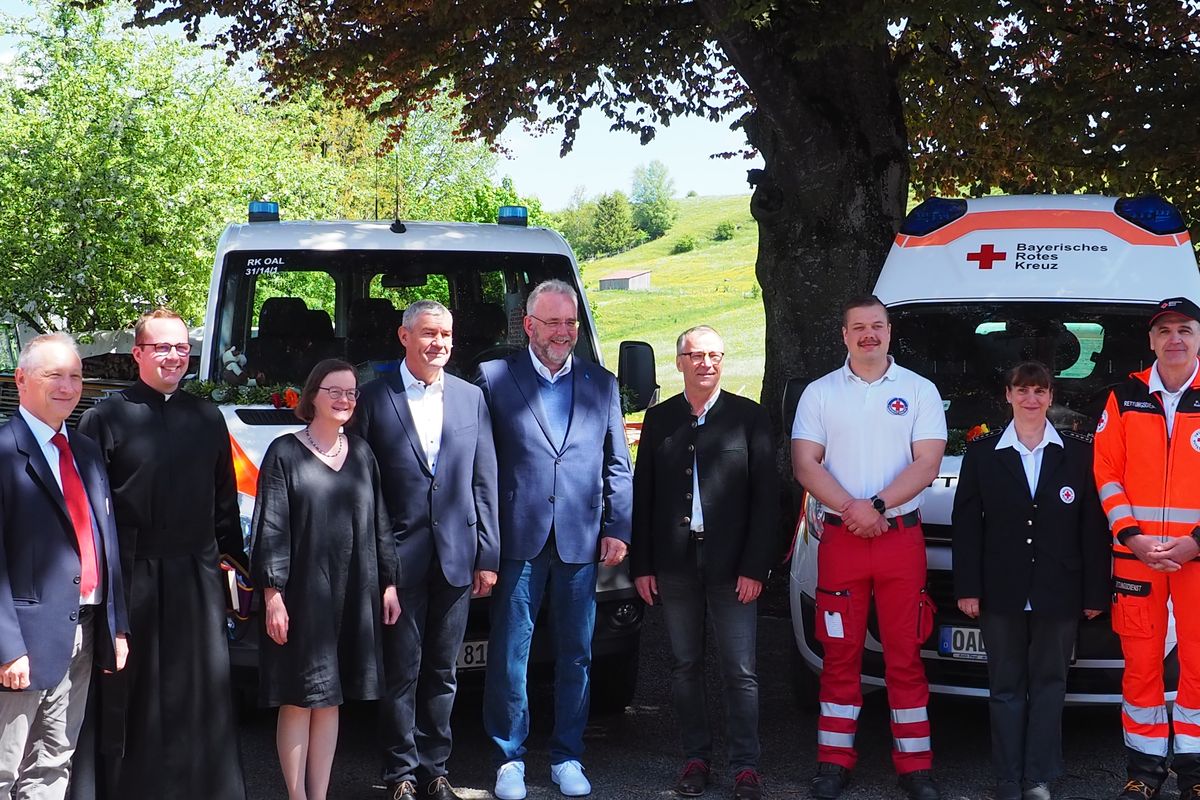 Mit einem feierlichen Tag der offenen Tür wurde die neue Rettungswache des Bayerischen Roten Kreuzes (BRK) in Obergünzburg am Oberen Markt 29 offiziell ihrer Bestimmung übergeben. Im Bild von links: Thomas Hofmann (BRK), Pater Michael, Henriette Gößner (Pastorin), Herbert Beck, Lars Leveringhaus (Bürgermeister), Dr. Christof Albert (BRK), Sebastian Horak (Wasserwacht), Claudia Beck (Bereitschaft) und Franz Settele (Wachleiter).