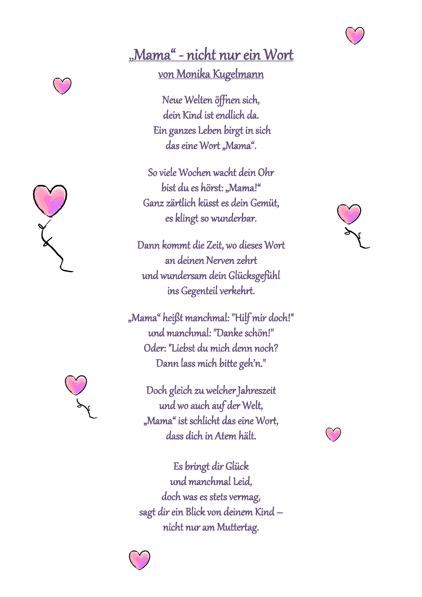 Wir bedanken uns bei Monika Kugelmann, dass wir ihr Gedicht zum Ehrentag aller Mütter veröffentlichen dürfen.