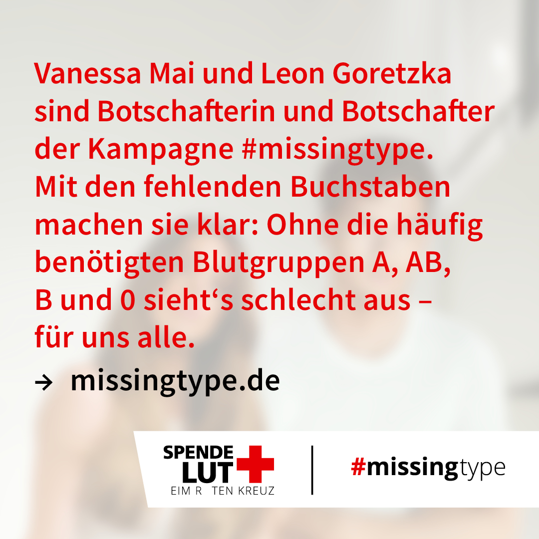 Vanessa Mai und Leon Goretzka unterstützen als Botschafterin und Botschafter unsere diesjährige #missingtype Kampagne und machen auf die Notwendigkeit von Blutspenden aufmerksam. Vielen Dank!