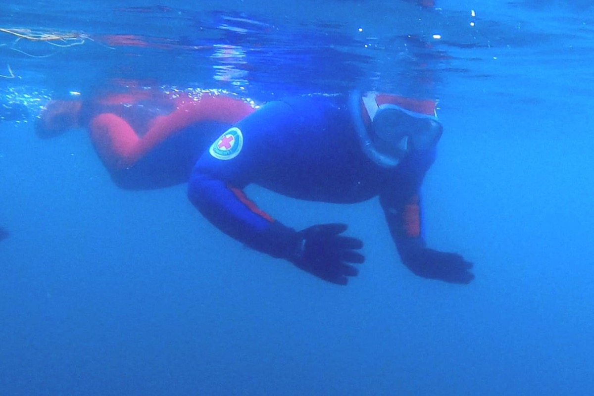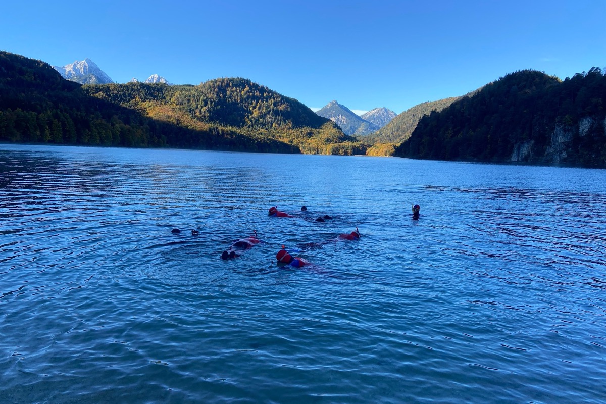 Keine Scheu vor kaltem Wasser bewiesen Mitglieder der Wasserwacht Füssen. Obwohl der Alpsee bei Hohenschwangau bereits in herbstlichem Schatten lag, übten fünf Wasserretter der Schnelleinsatzgruppe Füssen (SEG) mit Schnorchel und Taucherbrille das Absuchen des Gewässers im Uferbereich. Dies ist ein Bestandteil der Ausbildung zum Wasserretter. Zum Schutz trugen sie einen wärmenden Neoprenanzug mit Kopfhaube, Handschuhen und Neoprensocken. Zur Absicherung und selbst zur Übung waren drei Taucher mit im kühlen Nass. Dank Pressluftflasche übernehmen sie das Abtauchen in größere Tiefen.