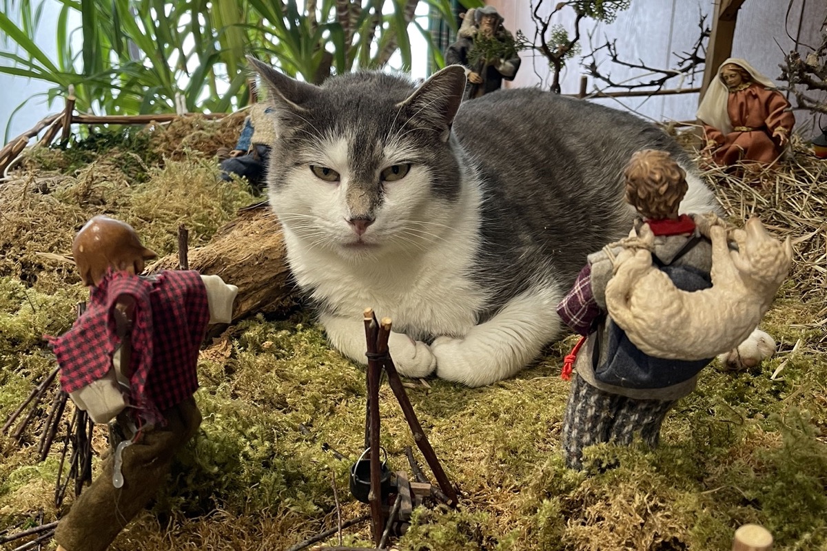 „Unser Kater wollte wohl die Krippengeschichte umschreiben und hat sich zu Ochs, Esel und Schaf gebettet“, mutmaßt Michael Stroeher, Einrichtungsleitung im Seniorenheim St. Michael in Füssen. Ob Hauskatze Wolfgang wirklich diesen Gedanken hegte oder sich einfach nur vom weichen Moos angelockt fühlte, bleibt unklar. Wolle, so sein Kurzname, sorgte auf jeden Fall für tierisch gute Unterhaltung bei allen Betrachtern der weihnachtlichen Krippe im Foyer der Senioreneinrichtung.