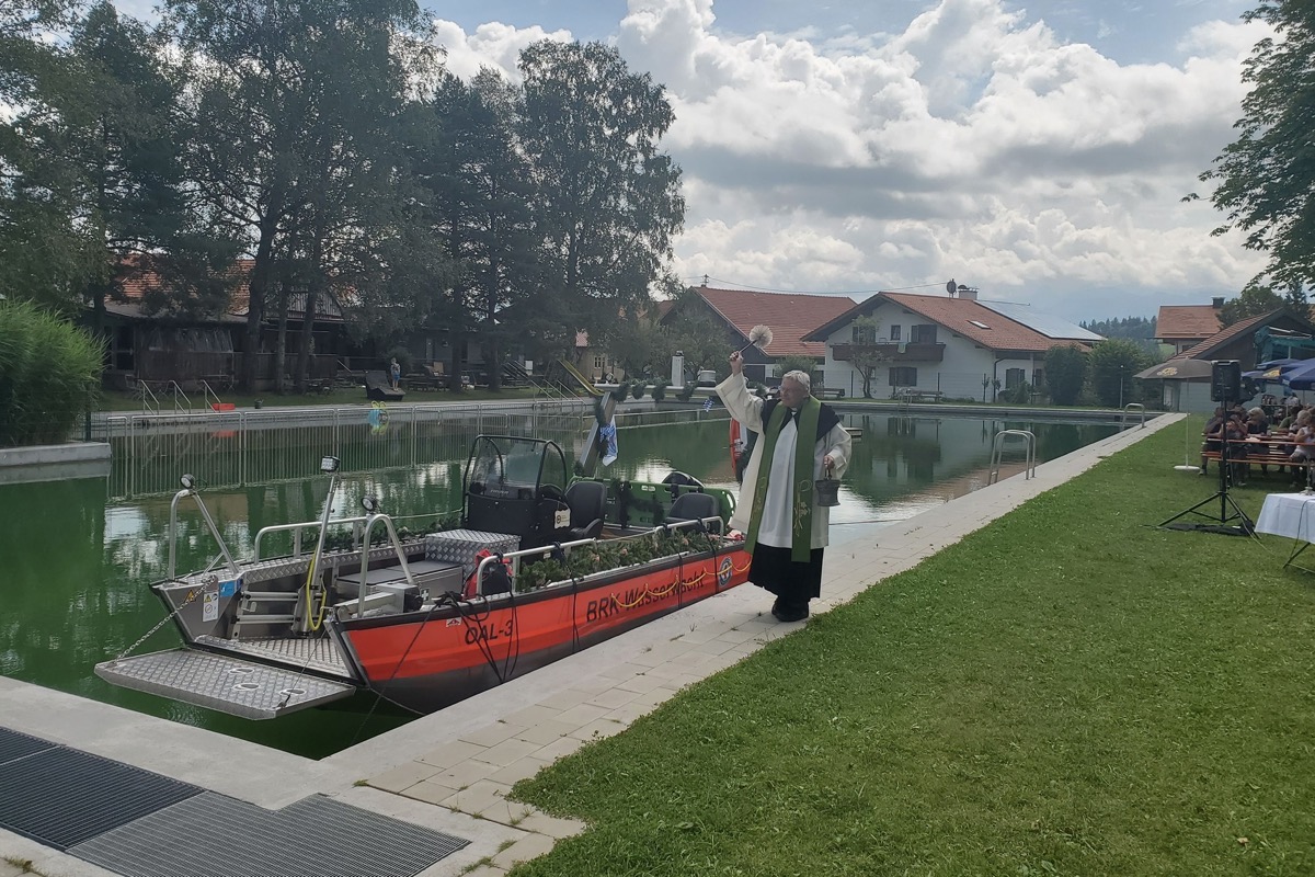 Im Rahmen des festlichen Zusammenkommens segnete Pfarrer Hans Ulrich Schneider nachträglich das bereits seit zwei Jahren im Dienst befindliche neue Motorrettungsboot. Damit für die Schiffsweihe, wie es der Brauch vorsieht, eine Handbreit Wasser unter dem Kiel war, wurde das Boot kurzerhand vom Bootsliegeplatz am Forggensee-Ufer in das frisch sanierte Naturbad Wette umgesetzt. Ein Vorteil für die interessierten Gäste, die so die neue Technik aus nächster Nähe bestaunen konnten. Auch die ehemaligen Vorstände der Ortsgruppe, Werner Böck, Andreas Haust und Engelbert Walk, ließen es sich nicht nehmen, das neue Boot fachkundig zu begutachten.