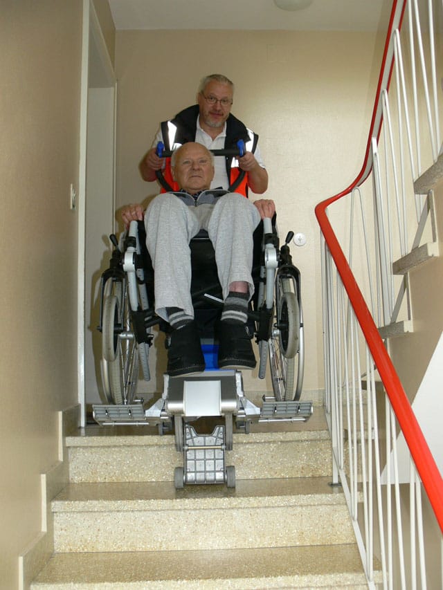 Für Kunden, die im Alltag auf den Rollstuhl angewiesen sind und auf dem Weg nach draußen ein Treppenhaus passieren müssen, bietet das Rote Kreuz in Kaufbeuren seit kurzem einen ganz besonderen Service: Unser mobiles Treppensteiggerät oder “Treppenlifter”.