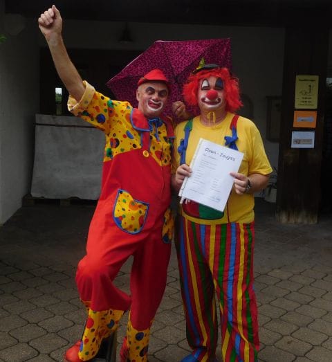 Im Anschluss erfreuten sich die zahlreichen Besucher am bunten Programm. Das hatten die Mitarbeiter und Bewohner im Vorfeld mit liebevollem Engagement zusammengestellt. So konnte man sich über die lustige Darbietung der Clowns Lulu und Fridolin amüsieren. Am Verkaufsladen hatten die Besucher die Wahl zwischen exklusiven Töpferwaren oder individuellen Grußkarten. Alle diese Waren werden von Bewohnern der hausinternen Arbeits-und Beschäftigungstherapie und der Förderstätte hergestellt.