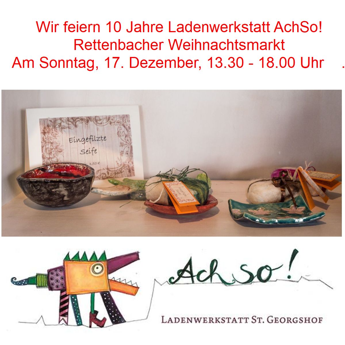 Das AchSo!-Team lädt alle herzlich ein, den Erfolg der Idee - Herstellung und Verkauf unter einem Dach - zu feiern. Bei Punsch, Glühwein und einer süßen Überraschung besteht am Jubiläumsonntag Gelegenheit, durch den Laden zu bummeln. Die Klienten bieten dort ihre eigenhändig hergestellten dekorativen oder nützlichen Produkte an. Das Sortiment besteht aus Töpfer- und Holzwaren, Glückwunschkarten aller Art, Näh- und Filzarbeiten, Papeterie-Artikeln, Kerzen, „Zapfenanzündern“ für den Holzofen und Dekoartikeln aus den unterschiedlichsten Materialien. Als Dankeschön für die 10-jährige Treue wartet auf alle Kunden ein kleines Geschenk.