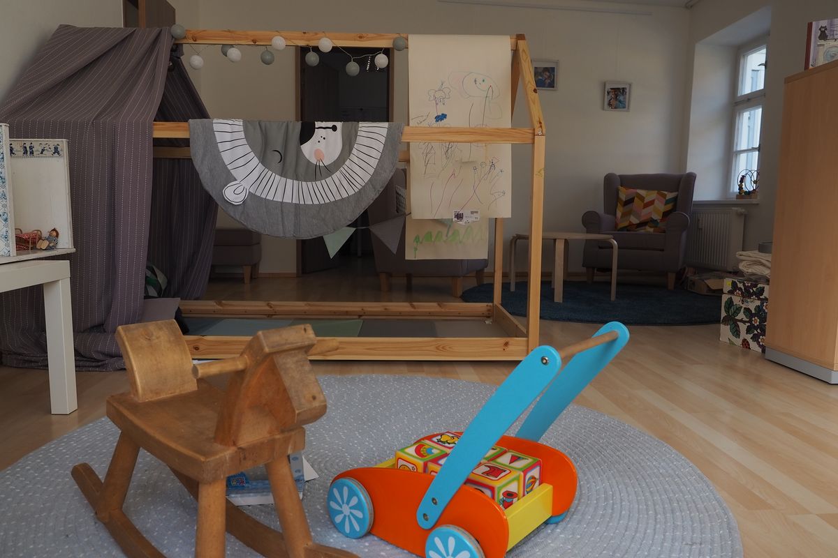 Die jüngsten Besucher freuen sich über das aufgeräumte helle Spielzimmer mit Puppenküche. „Spielen und zur Ruhe kommen“, könnte das Motto für diesen Raum lauten. Dazu passt die Bücherecke. „Altersgerechte anschauliche Bücher sind für uns ein guter Einstieg, um mit Klienten, deren Kindern oder Angehörigen ins Gespräch zu kommen“, erklärt Stoll. Titel wie „Sonnige Traurigtage“ oder „Mama Mia und das Schleuderprogramm“ ermöglichen einen kindgerechten Zugang zu psychischen Erkrankungen. Aber auch für manche Eltern sei es schon ein Trost, zu erfahren, dass über ‚ihre‘ Krankheit sogar Bücher geschrieben wurden, ergänzt Stoll. „Ein Zeichen, dass nicht nur sie, sondern auch andere die Krankheit haben.“