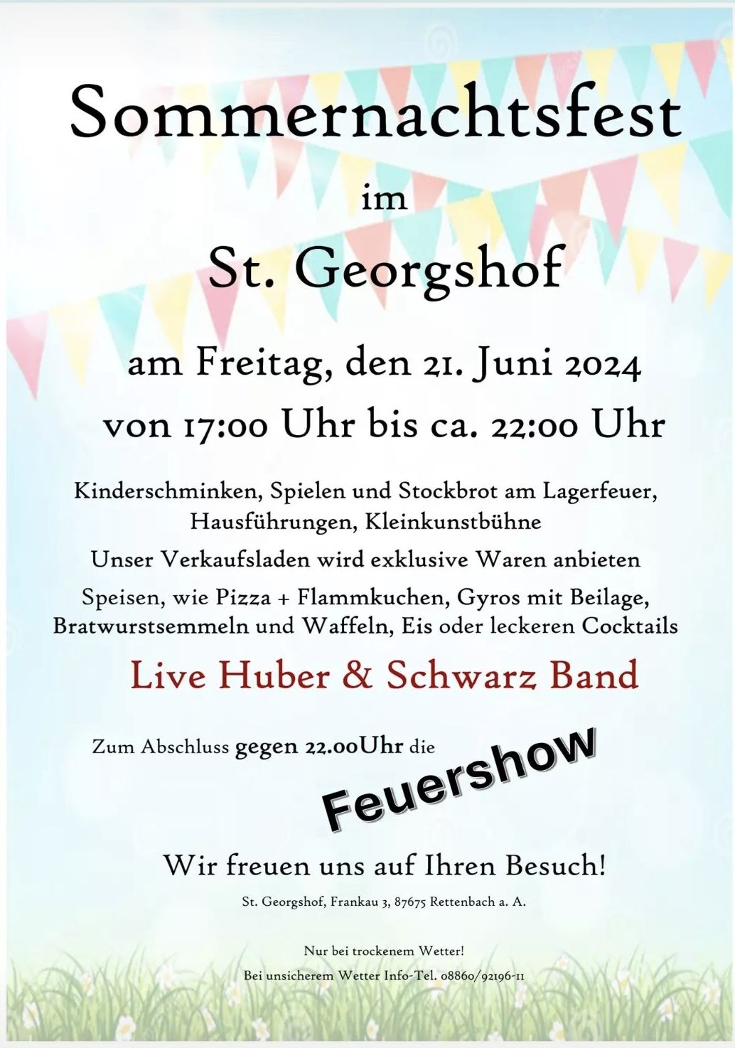 Am Freitag, 21. Juni, lädt der BRK St. Georgshof in Rettenbach am Auerberg zum traditionellen Sommernachtsfest in sein Gartengelände in der Frankau ein. Ab 17 Uhr warten ein abwechslungsreiches Programm mit Live-Band und Verpflegung auf die Besucherinnen und Besucher. Das Fest endet um 22 Uhr mit der traditionellen Feuershow.